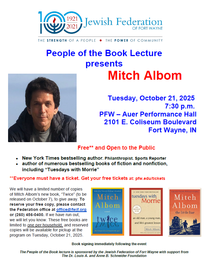You’re invited to the People of the Book Lecture presented by the Jewish Federation of Fort Wayne with acclaimed author Mitch Albom on Tuesday, October 21 at 7:30 p.m. at Purdue Fort Wayne’s Auer Performance Hall.